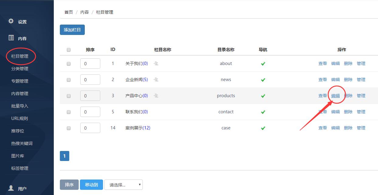 左側(cè)找到 [ 內(nèi)容 ] - [ 欄目管理 ] - 在需要顯示表單的欄目右側(cè)點擊 [ 編輯 ] (如二級欄目綁定,請點擊一級欄目右側(cè)展開圖標(biāo),即可看到該欄目下屬二級欄目列表!)