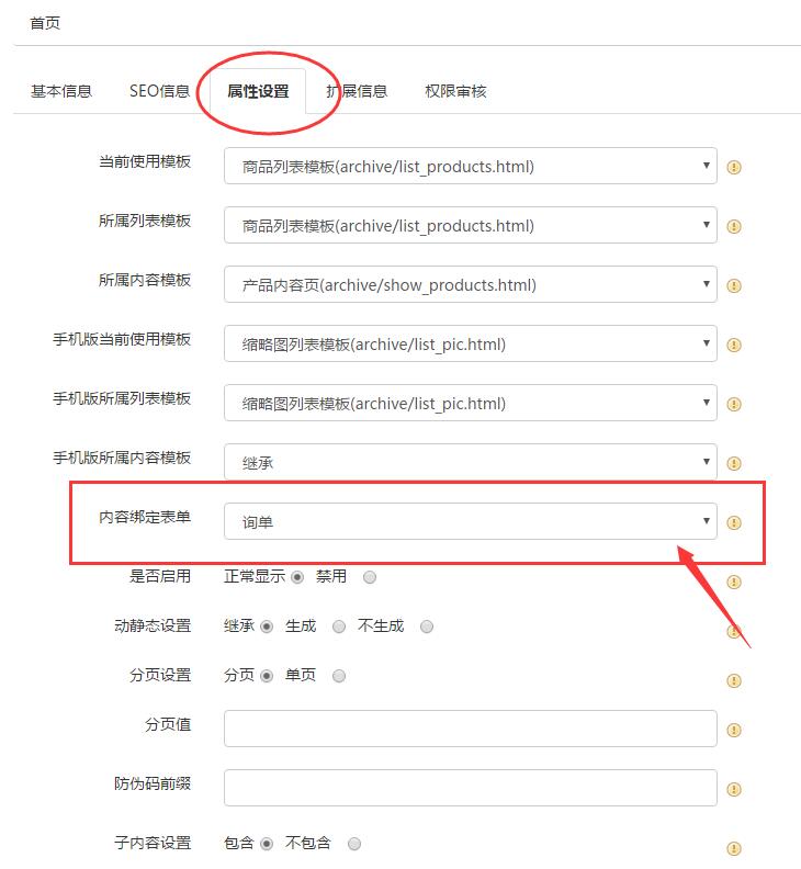 在欄目的[ 屬性設(shè)置 ] - [ 內(nèi)容綁定表單 ] 下拉框中,選擇需要顯示的表單(一個欄目只能綁定一個表單顯示!) ,如圖:
