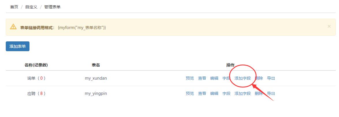提交后,生成一個新表單,但表單內容為空,如何向表單添加字段可參考如圖:
