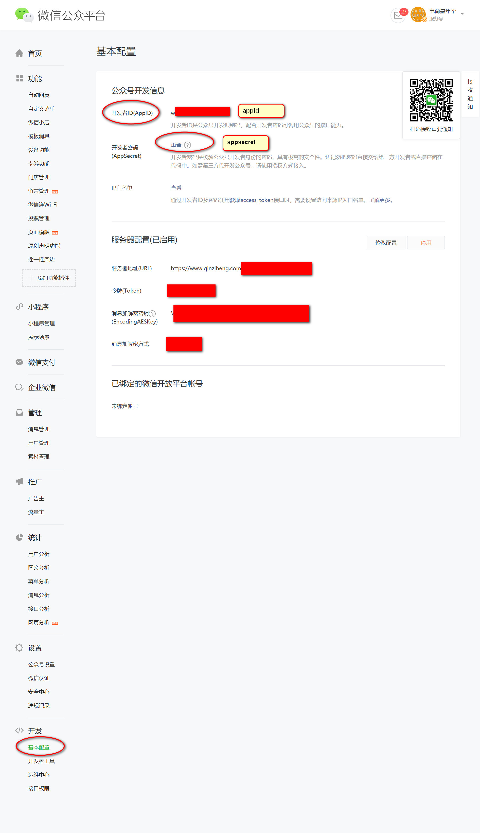 (3)APPID:登錄微信公眾號(hào)平臺(tái) https://mp.weixin.qq.com/,左側(cè)找到 [ 開(kāi)發(fā) ] - 基本配置 - 在公眾號(hào)開(kāi)放信息中可查看到開(kāi)發(fā)者ID(AppID),如圖: