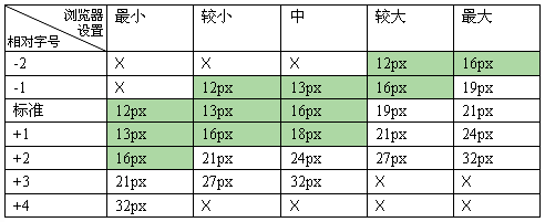 以IE瀏覽器為例,如果頁面上的文字被設(shè)置為相對字號(hào),那么它可以有五種不同的大小縮放:“小、較小、中、較大、大”。下表中是不同的相對字號(hào)在IE瀏覽器的不同設(shè)置中所顯示的實(shí)際字號(hào)(以象素為單位的字號(hào))。
